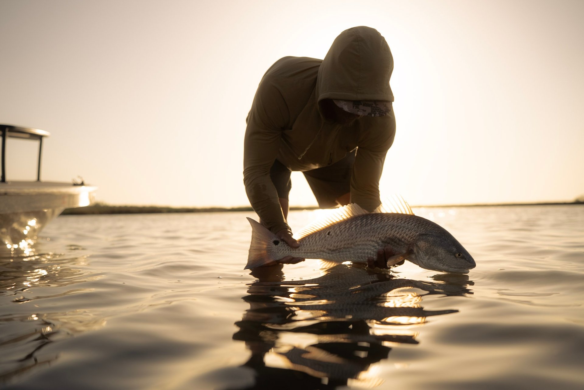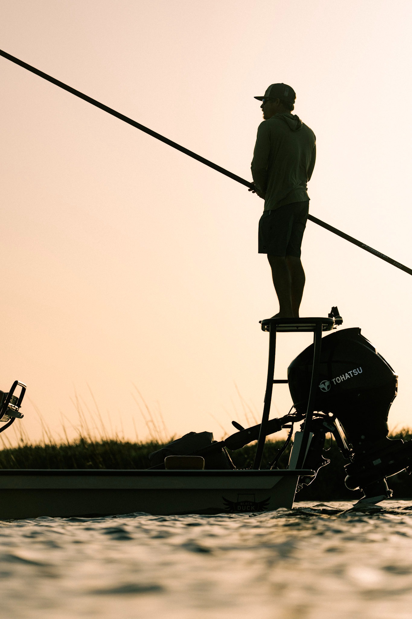 “Your capabilities are only as good as the tools you use.” That’s why Clay runs a Black Duck Skiffs Mantis—a shallow-draft, outboard jet-powered skiff handcrafted in Rockport, Texas. Built for stealth, stability, and unparalleled shallow water performance, it allows him to quietly stalk fish in remote, less pressured marshes.