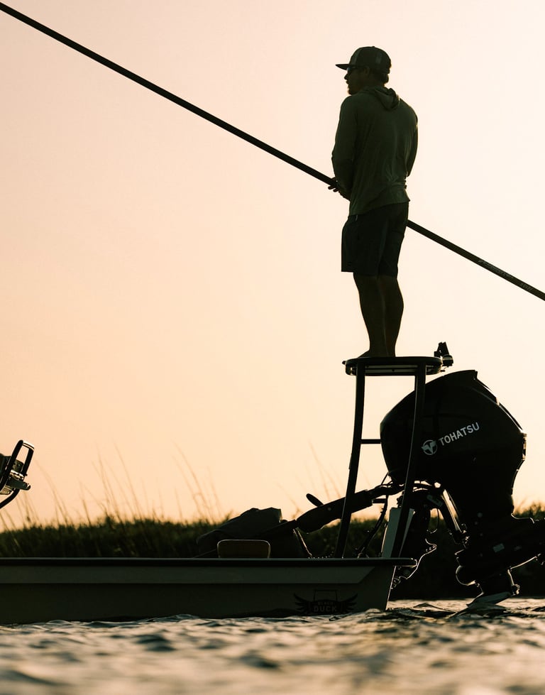“Your capabilities are only as good as the tools you use.” That’s why Clay runs a Black Duck Skiffs Mantis—a shallow-draft, outboard jet-powered skiff handcrafted in Rockport, Texas. Built for stealth, stability, and unparalleled shallow water performance, it allows him to quietly stalk fish in remote, less pressured marshes.